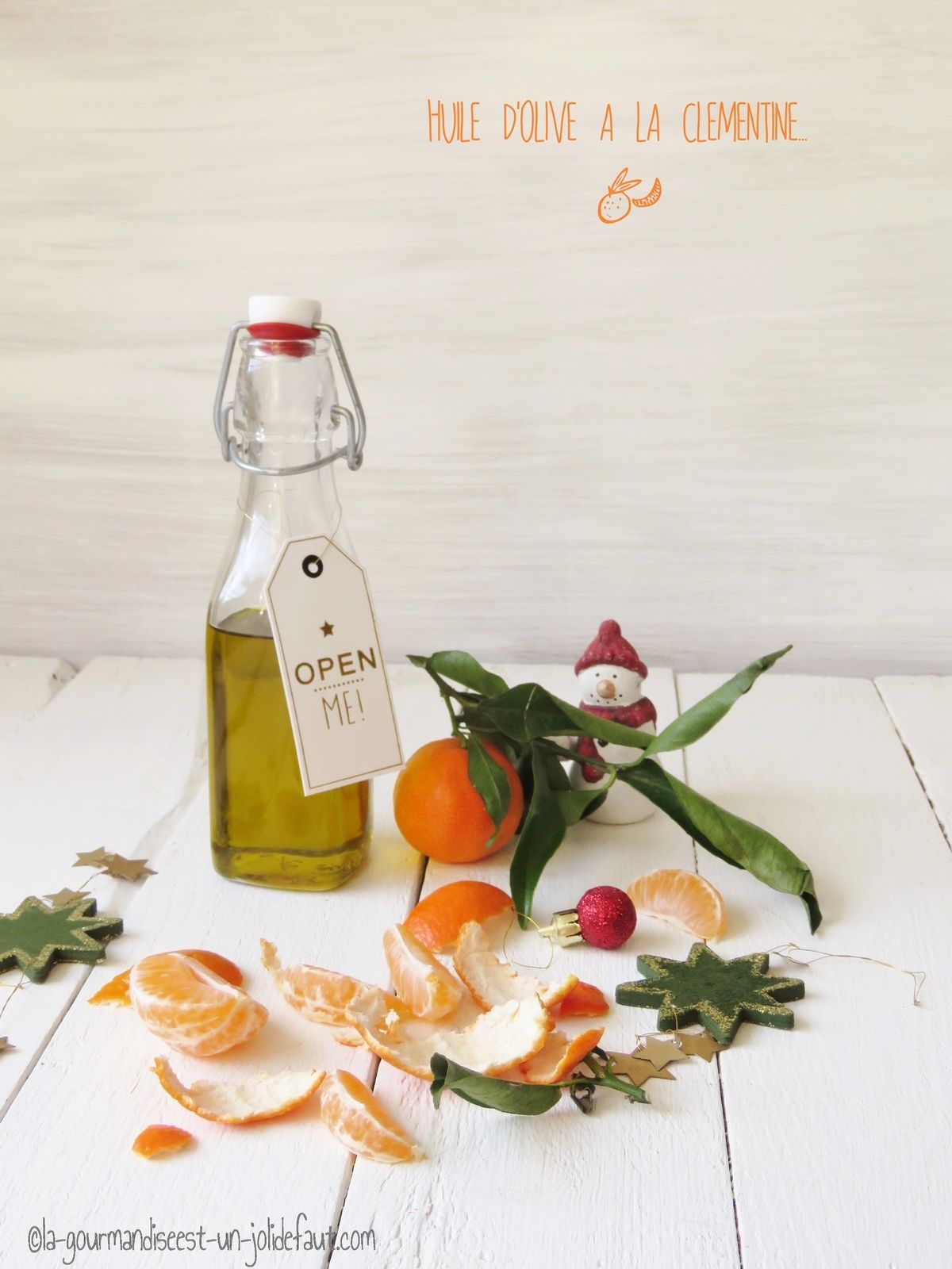 J’ai trouvée cette huile parfumée en me baladant sur Pinterest, j’ai été séduite par cette association de saveurs alors je l’ai aussitôt mise de coté en prévision des cadeaux gourmands que j’allais faire pour les fêtes de d’année. Un régal cette huile, le parfum de la clémentine est subtil et délicat il fait merveille avec du poisson ou sur une salade. Pierre Hermé l’a même utilisé dans une ganache au chocolat pour garnir un macaron, il va falloir que je la teste. En attendant voila la recette toute simple que j’ai trouvée ici.
